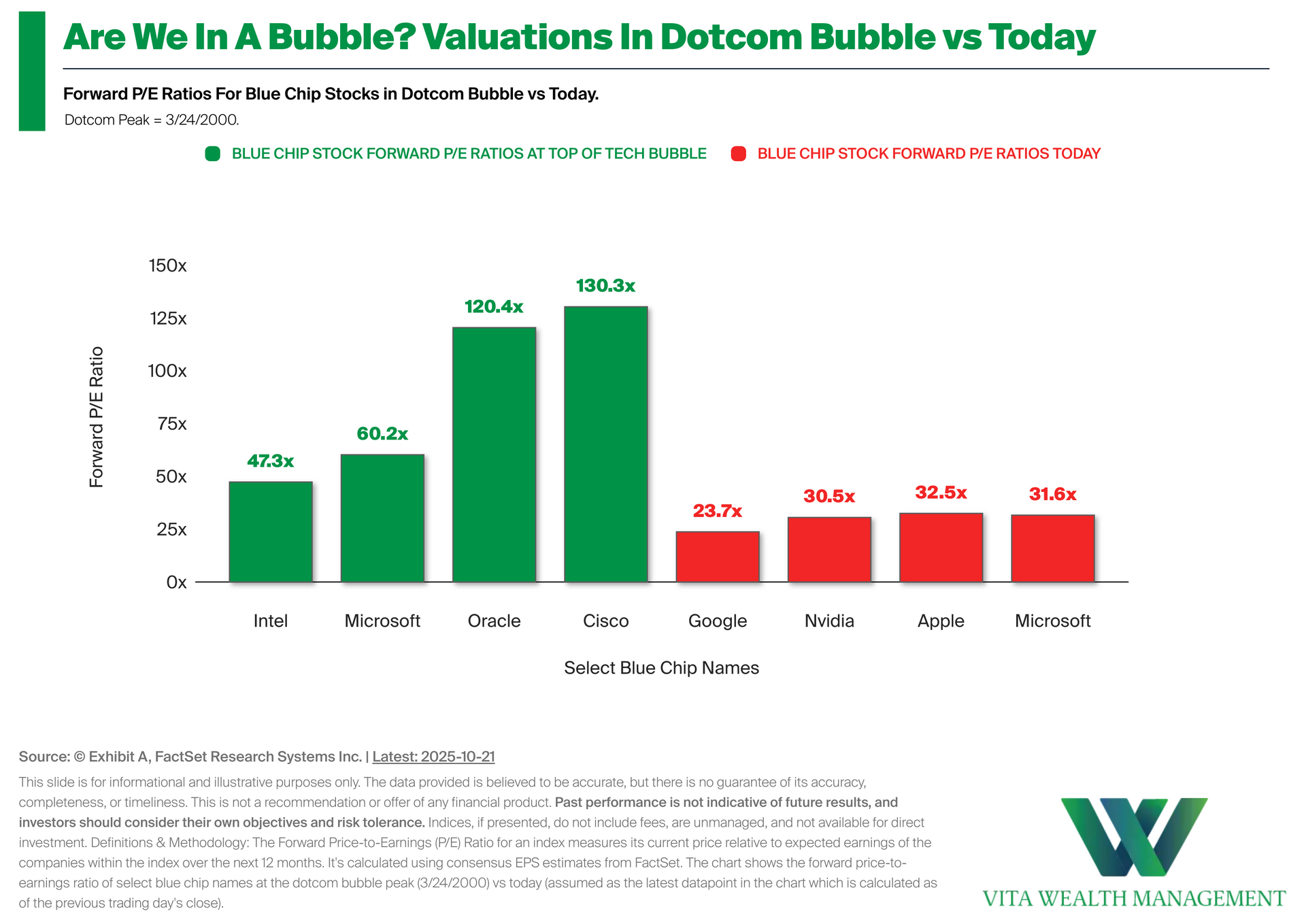 •Valuations In Dotcom Bubble vs Today: The chart shows the forward P/E ratios of select blue-chip names in the S&P 500 during the dotcom bubble compared with their current valuations. • A Look at the Data: At the March 2000 peak, leading tech names like Cisco and Oracle traded at extreme valuation multiples, with forward P/Es well above 100x. Today's largest S&P 500 constituents trade at far lower levels. • Investment Implications: T he comparison highlights that while valuations have expanded, today's market environment is supported by stronger fundamentals, more diversified earnings, and greater profitability than during the 2000 cycle.
