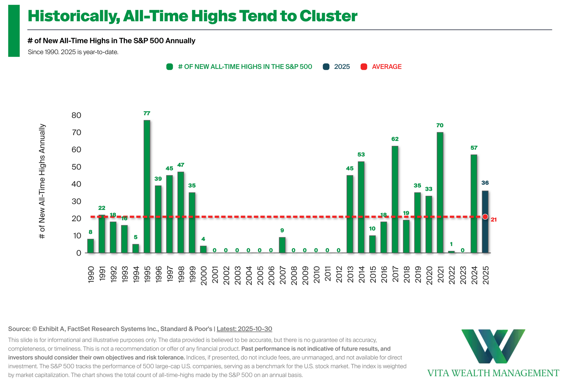 •Measuring Time At or Near All-Time Highs: The chart tracks how often the S&P 500 has stayed within 3% of its all-time highs over time, highlighting periods of extended market strength. • A Current Look at the Data: As of October 9, 2025, the S&P 500 has spent 90 trading days in a row within 3% of an all-time high. • Investment Implications: While data shows that markets have historically remained near record highs for extended periods during strong economic cycles, investors should remember conditions can change and past trends may not repeat.