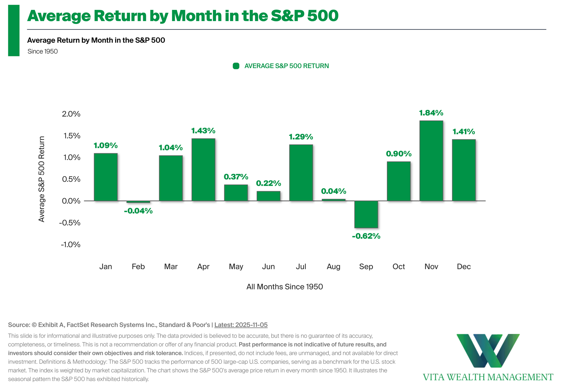 •What is Seasonality?: Seasonality refers to recurring trends in market performance during specific times of the year. The S&P 500 has historically shown seasonal patterns driven by factors such as earnings seasons, macroeconomic events, and investor behavior. However, these trends may vary each year and are not guaranteed. • Investment Implications: Seasonality provides historical context for understanding market patterns throughout different months of the year. However, seasonal patterns should be viewed as historical observations rather than predictive indicators, as market conditions and external factors can influence actual results each year.