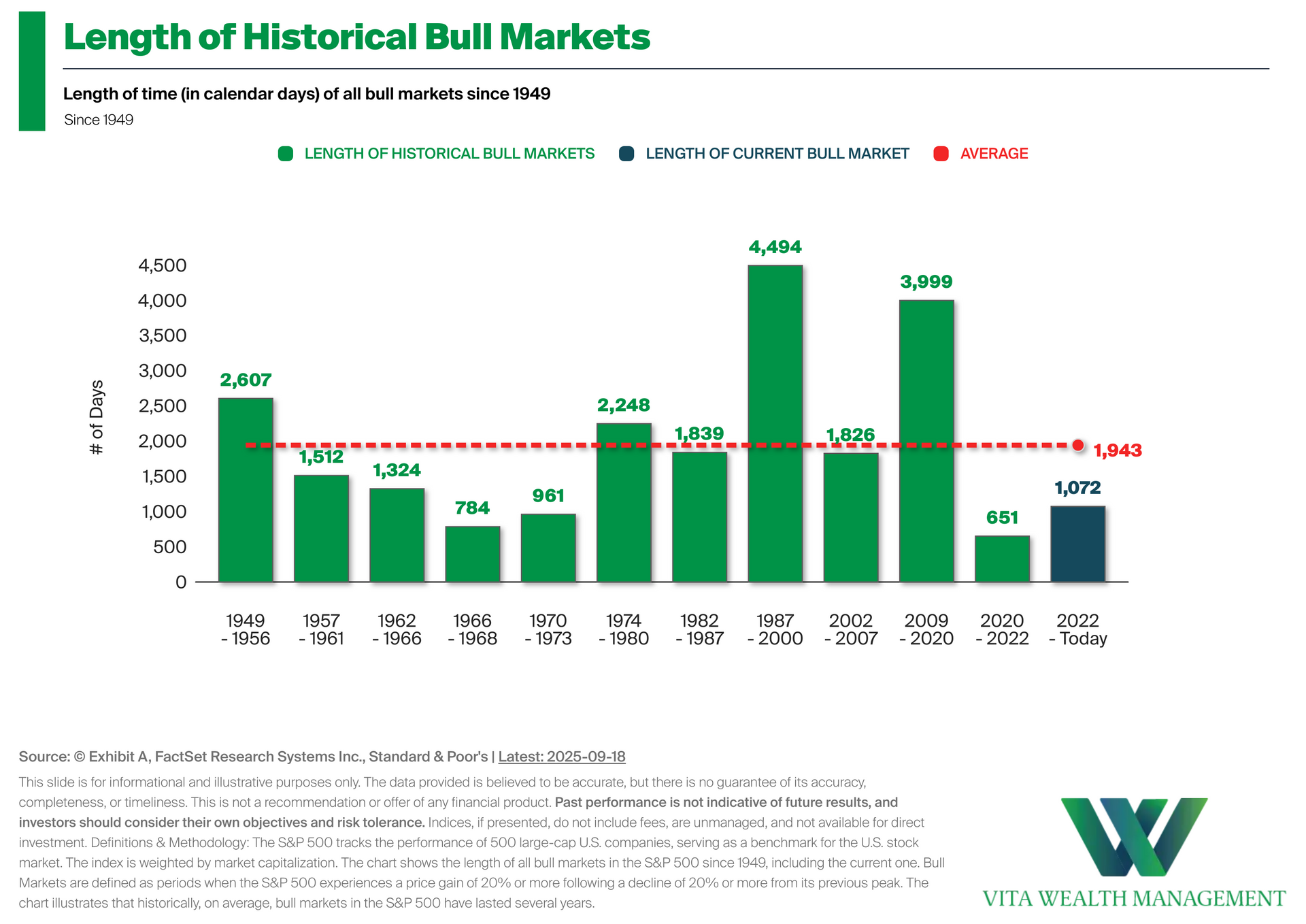 • Length of Historical Bull Markets: This chart shows the length of past S&P 500 bull markets, measured in calendar days since 1949. While each cycle varies, history reminds us that bull markets can endure for years. Staying invested during these periods of growth has been a key driver of long-term portfolio outcomes and overall market recovery. • A Recent Look at the Data: We have been in a bull market for 1,073 days since the 10/12/2022 low. This compares to the average length of 1,943 days in all bull markets since 1949. • Investment Implications: For investors, the chart highlights how the duration of bull markets has varied over time, with some lasting several years.